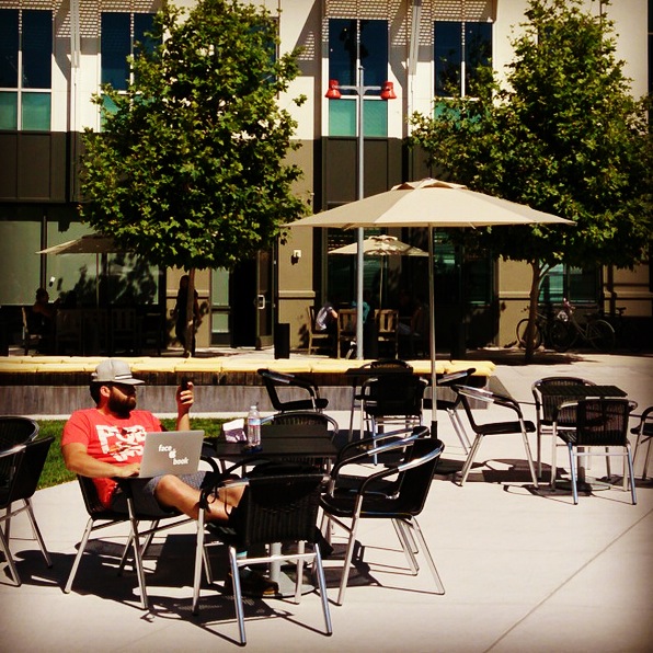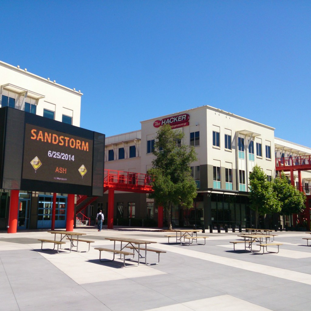 Nach einem relativ unkomplizierten Registrationsprozess werden die Tore für uns geöffnet. Ha! Also doch! Das Innere des Campus ist um ein vieles spektakulärer als die Fassade vermuten liess und erinnert mich etwas an den Europapark. Das Herz des Campus bildet der Hacker Square mit seinen grossen Screens, Pizza Restaurants, Burger Läden und Coffee Shops. Leute in Filp Flops schlendern an uns vorbei oder sitzen mit Headphones und iPad in der Sonne. Okay. Hier lässt es sich leben. Äh. arbeiten.